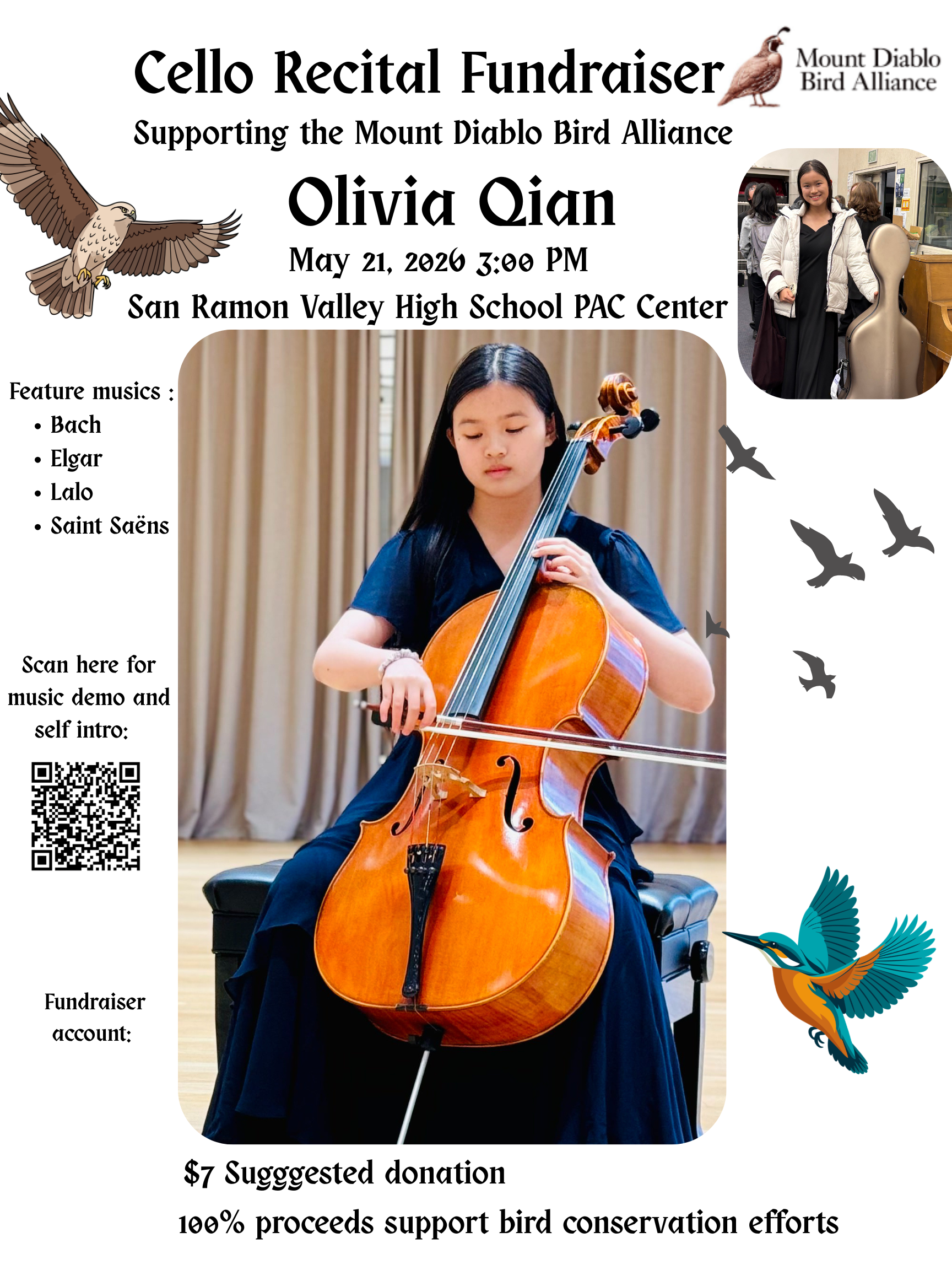 Olivia Qian, a junior at San Ramon Valley High School (SRVHS) and founder of the school’s bird-watching club, is hosting a solo cello recital fundraiser on Thursday, May 21, 2026, at 3:00 PM. The performance will take place at the San Ramon Valley High School Performing Arts Center and will feature masterworks by Bach, Saint-Saëns, Elgar, and Lalo.